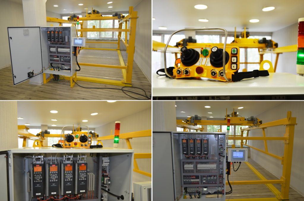 Кран Стенд грузоподъемностью 200кг, пролетом 2,5м, длина эстакады 4м построен на базе мотор редукторов SEW,  абсолютных и инкрементальных энкодеров, датчиков измерения расстояния, в зависимости от требований системы управления на стенд устанавливаются и тестируются различные приборы и дополнительные датчики.⁠